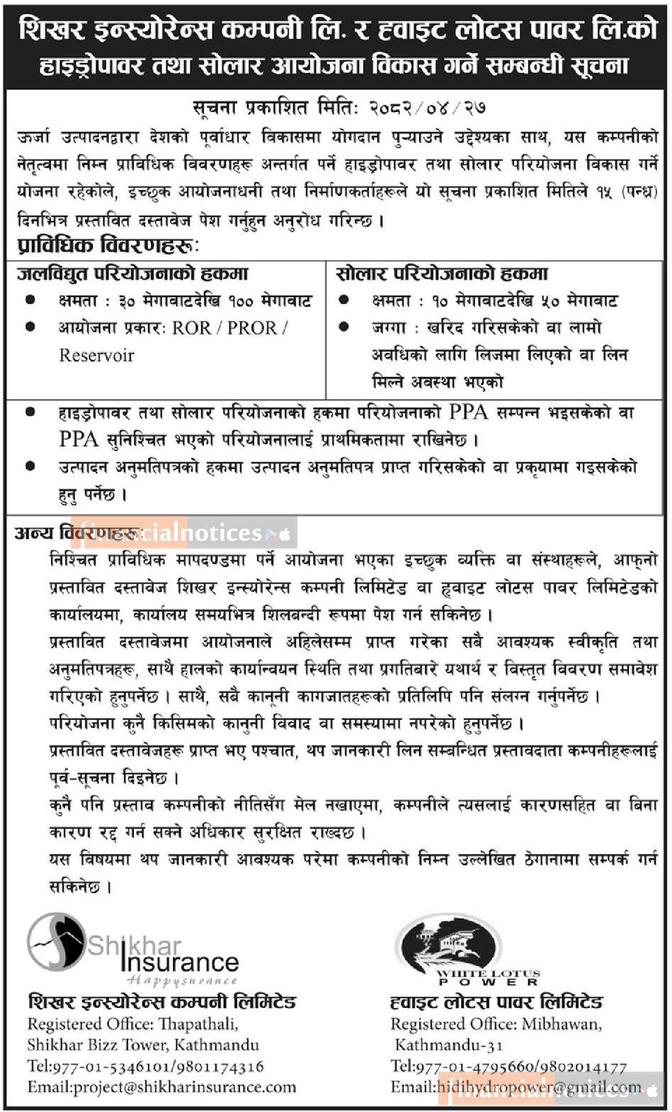 शिखर इन्स्योरेन्स र ह्वाइट लोटस पावरद्वारा जलविद्युत तथा सोलार आयोजना विकासका लागि प्रस्ताव आह्वान ब