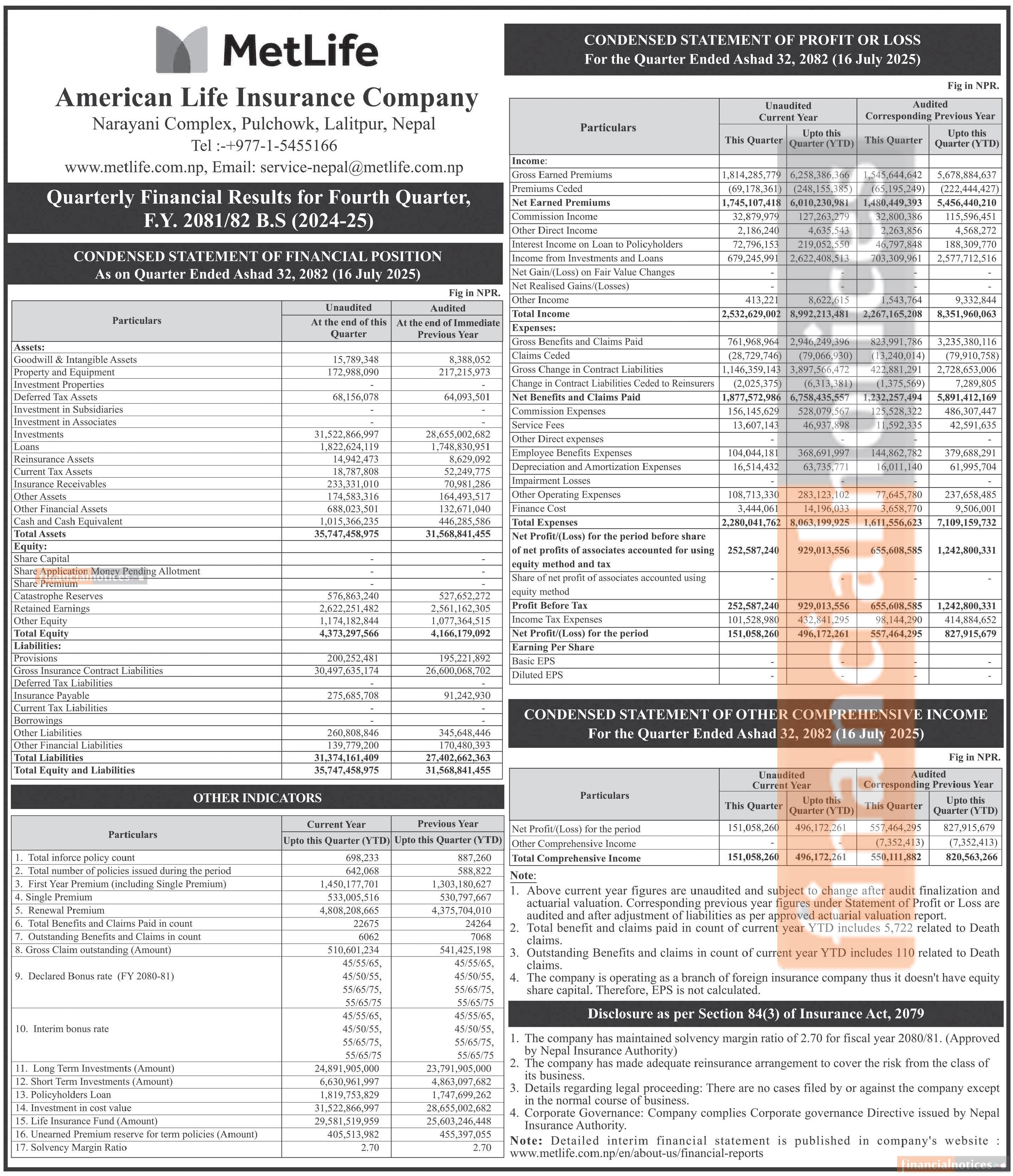 Metlife Insurance has posted a net profit of Rs 496.17 million and published its 4th Quarter