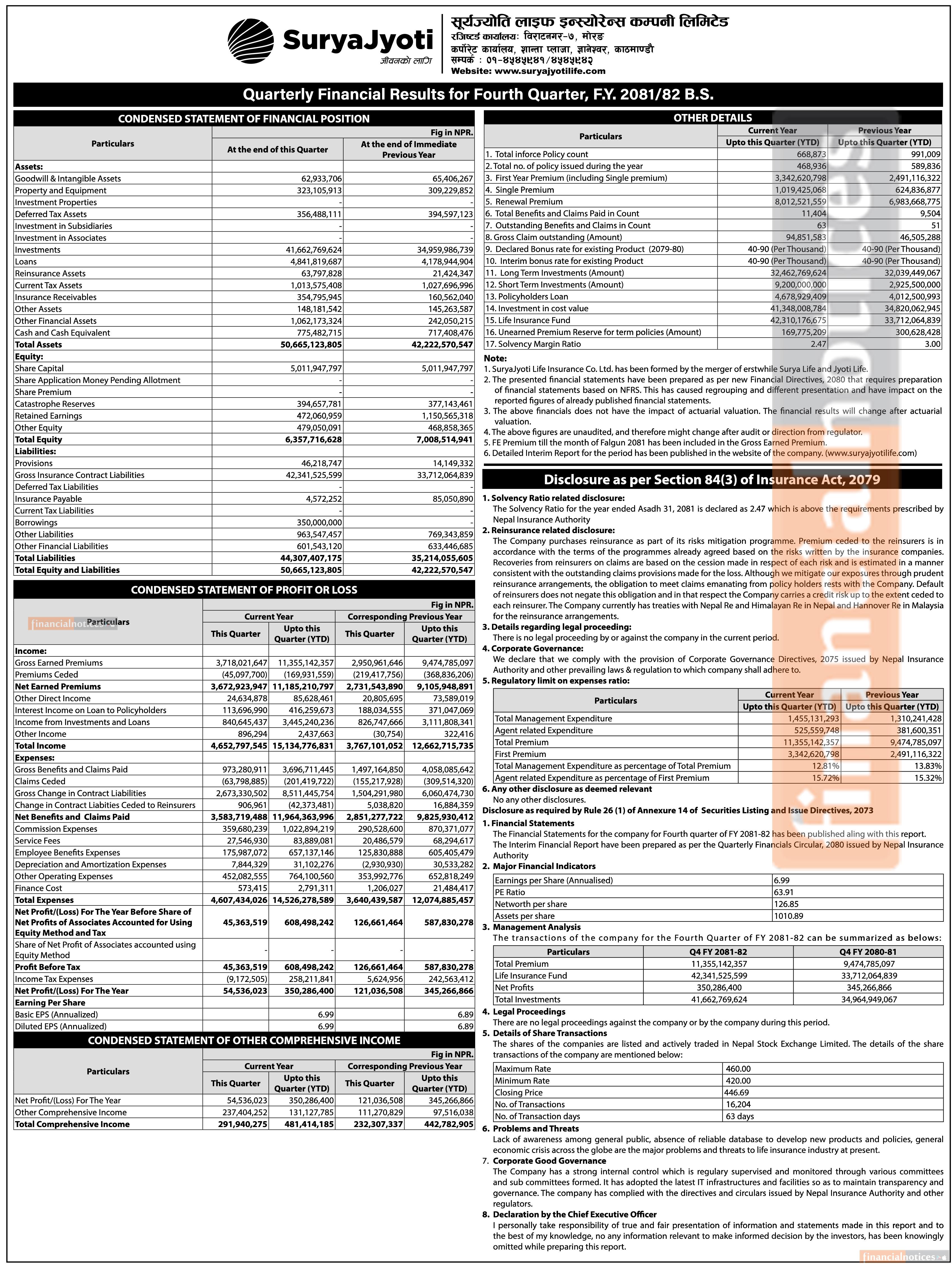 SuryaJyoti Life Insurance has posted a net profit of Rs 350.28 million and published its 4th quarter