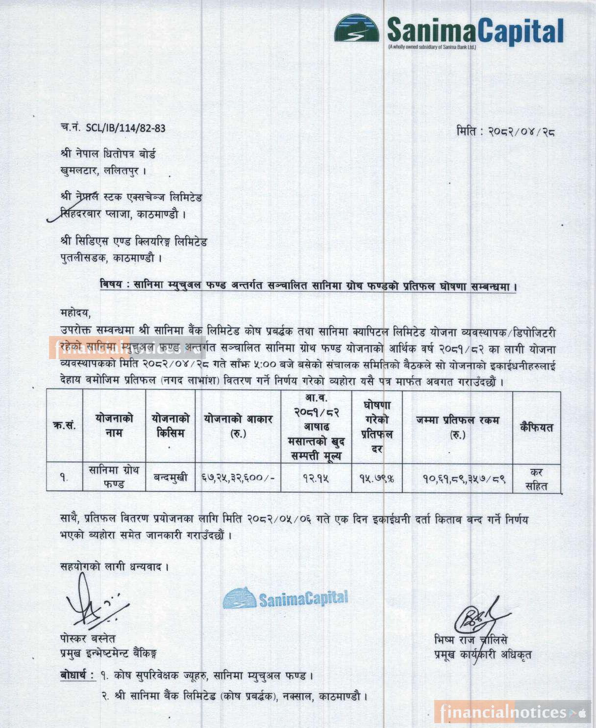 सानिमा ग्रोथ फण्डको नगद लाभांश घोषणा सम्बन्धी सूचना