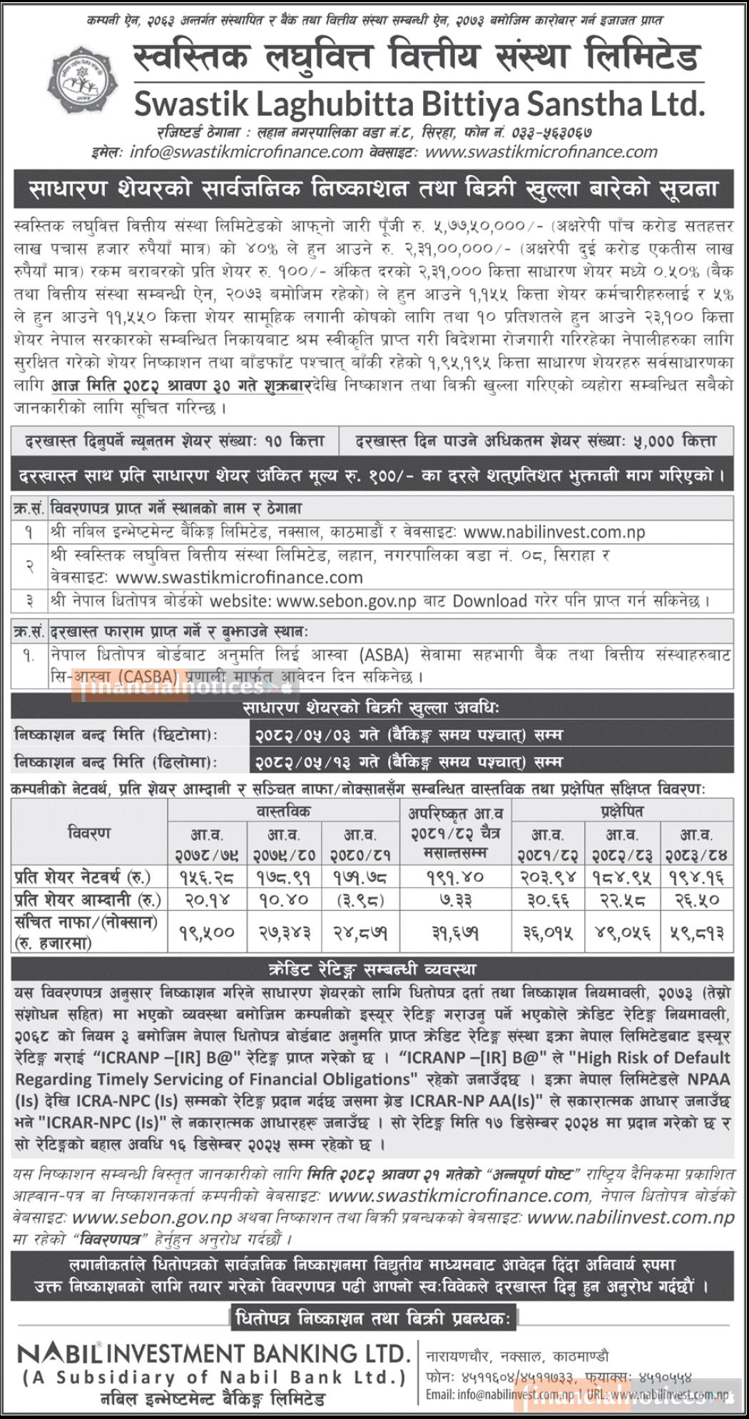 स्वस्तिक लघुवित्तको आईपीओ सर्वसाधारणका लागि निष्काशन तथा बिक्री खुला सम्बन्धी सूचना