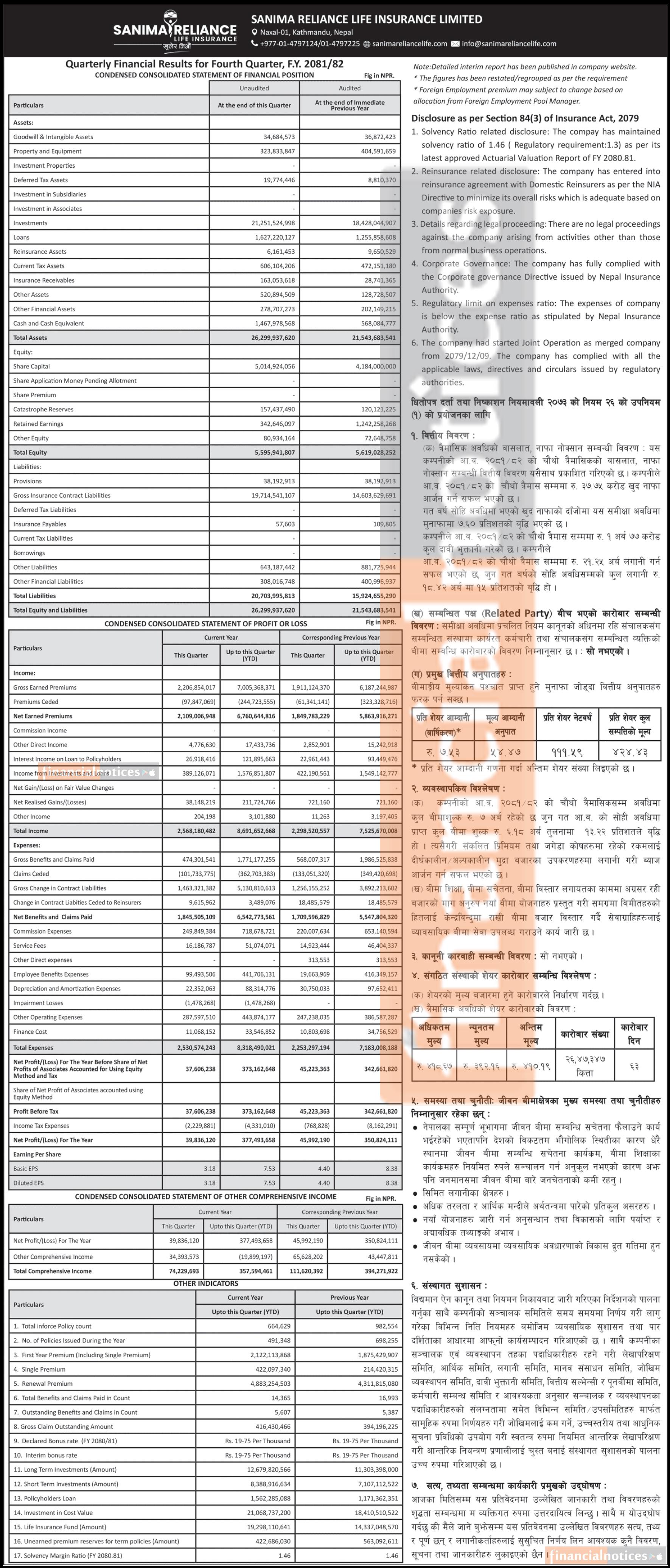 सानिमा रिलायन्स लाइफ इन्सुरेन्सको वित्तिय विवरण सार्वजनिक, खुद नाफा ३७ करोड ७४ लाख रुपैयाँ - Q4 Rep