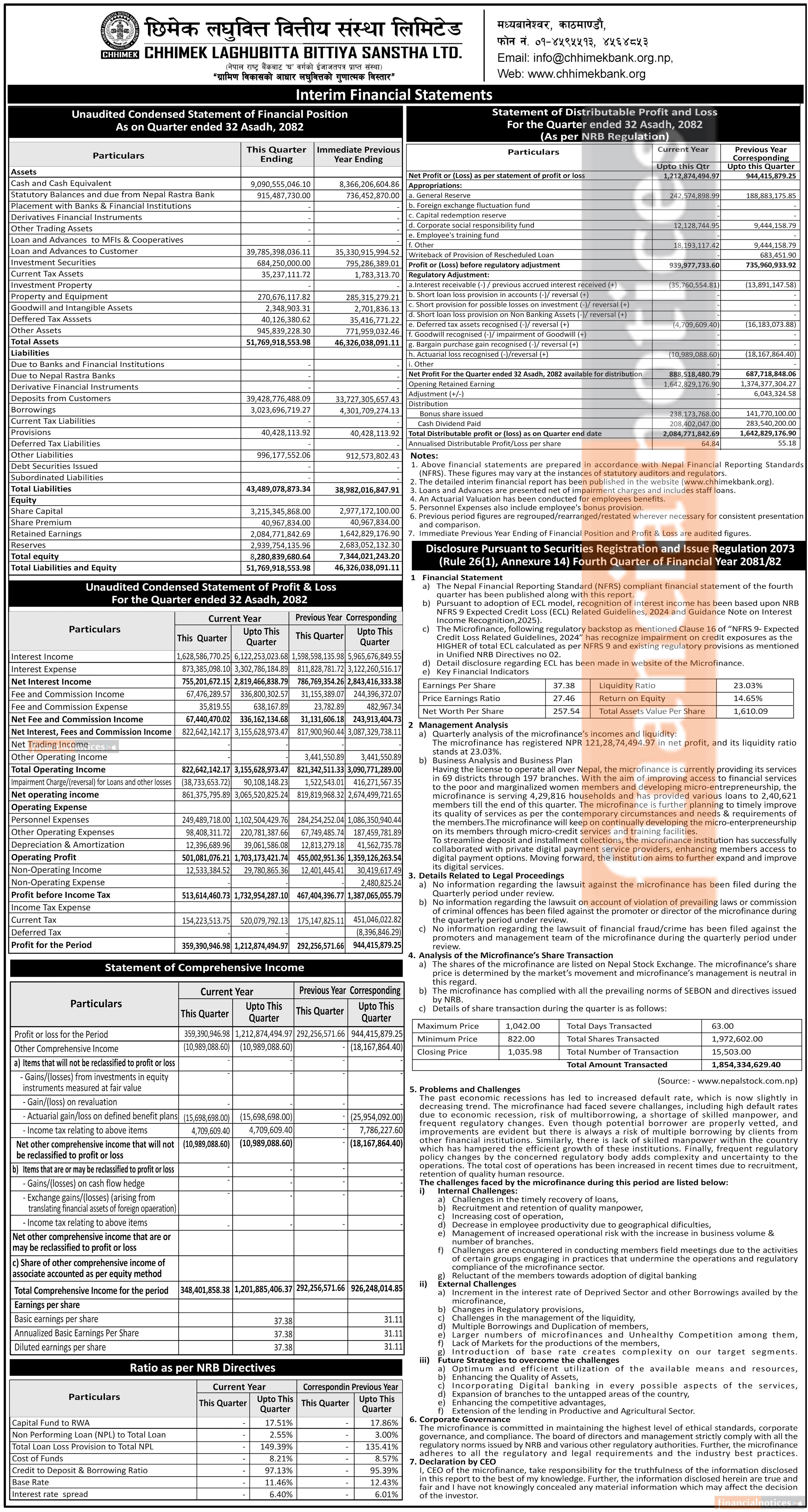 छिमेक लघुवित्तको वित्तिय विवरण सार्वजनिक, खुद नाफा १ अर्ब २१ करोड २८ लाख रुपैयाँ - Q4 Report -