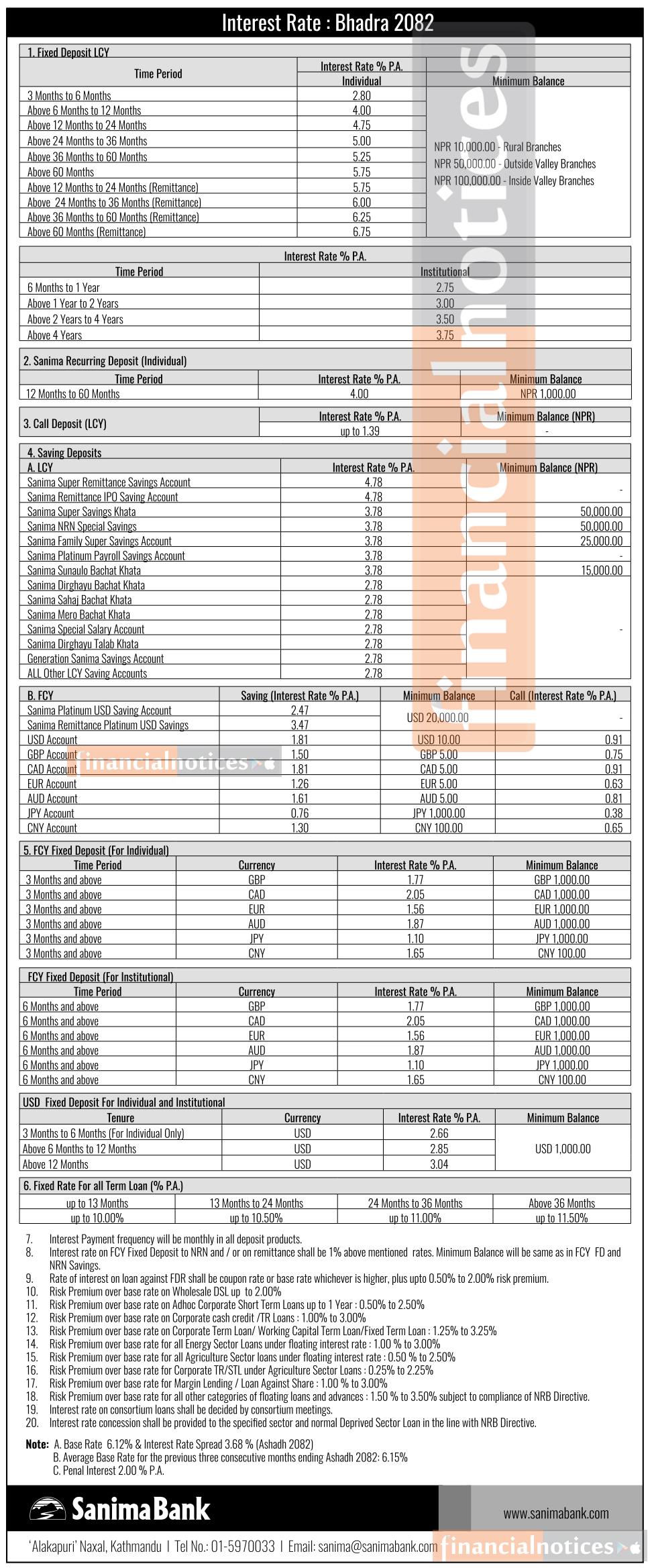सानिमा बैंकले परिवर्तित ब्याजदर तालिका सार्वजनिक गरेको छ । विवरण अनुसार बैंकको ब्याजदर भाद्र १ गतेदेखि लागु हुनेछ ।