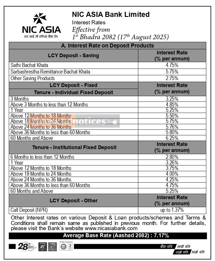 एनआईसी एसिया बैंकको नयाँ ब्याजदर सार्वजनिक सम्बन्धी सूचना - Interest Rates -