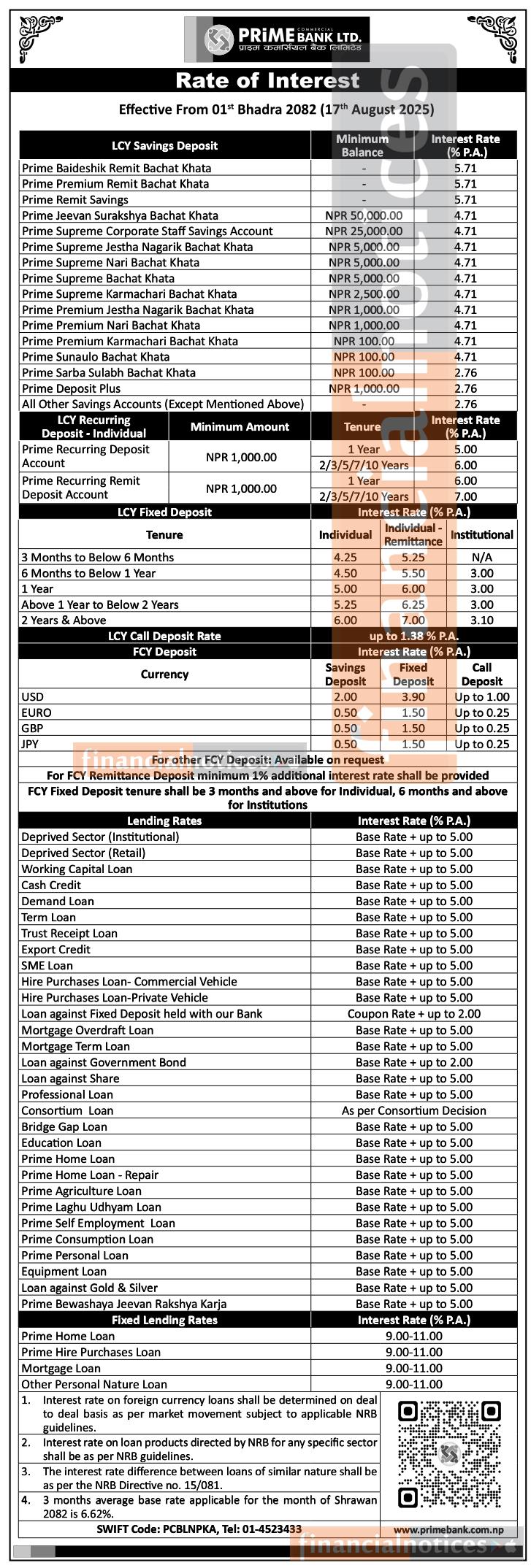 प्राइम बैंकले भाद्र १ गतेदेखि लागु हुने गरी आफ्नो नयाँ ब्याजदर तालिका सार्वजनिक गरेको छ ।