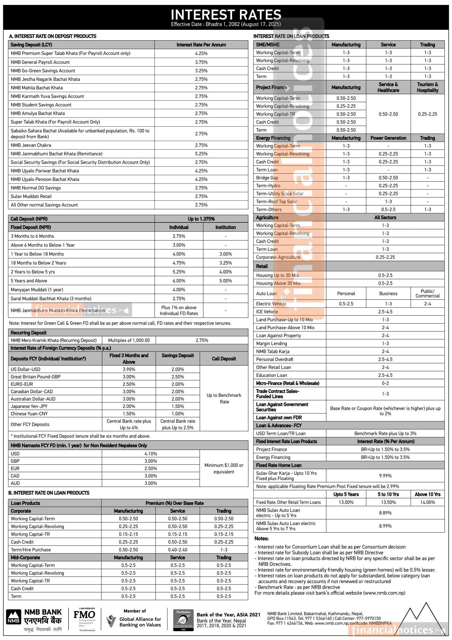 एनएमबी बैंकले भाद्र १ गतेदेखि लागु हुने गरी आफ्नो नयाँ ब्याजदर तालिका सार्वजनिक गरेको छ ।