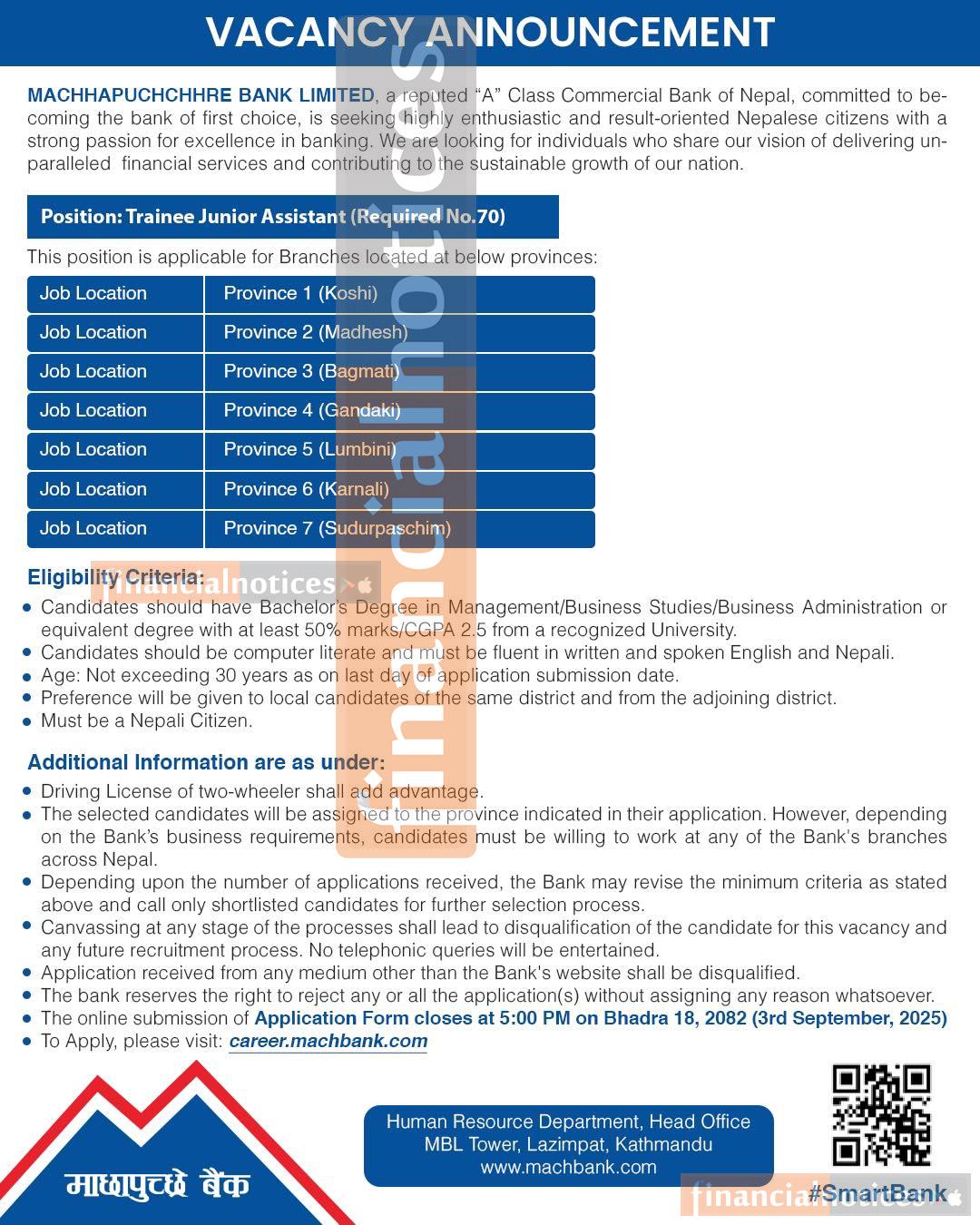 Machhapuchchhre Bank Limited, a reputed “A” Class Commercial Bank of Nepal, has announced a vacancy for 70 Trainee Junior Assistant positions. The Bank is seeking highly enthusiastic and result-oriented Nepalese citizens who aspire to build their careers in the banking sector.