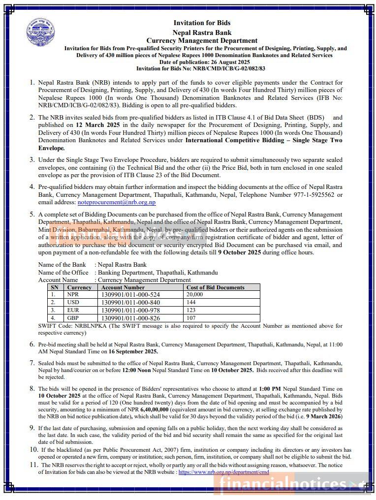 नेपाल राष्ट्र बैंकले प्रि–क्वालिफाइड सुरक्षा प्रिन्टर कम्पनीहरूबाट १,००० रुपैयाँ दरका ४३ करोड रकम बराबरको बैंक नोट डिजाइन, मुद्रण, आपूर्ति सेवाका लागि बोलपत्र आह्वान गरेको छ। बैंकले सूचना मार्फत इच्छुक कम्पनीहरूलाई तोकिएको समयभित्र आवश्यक कागजातसहित प्रस्ताव पेस गर्न आह्वान गरेको छ।