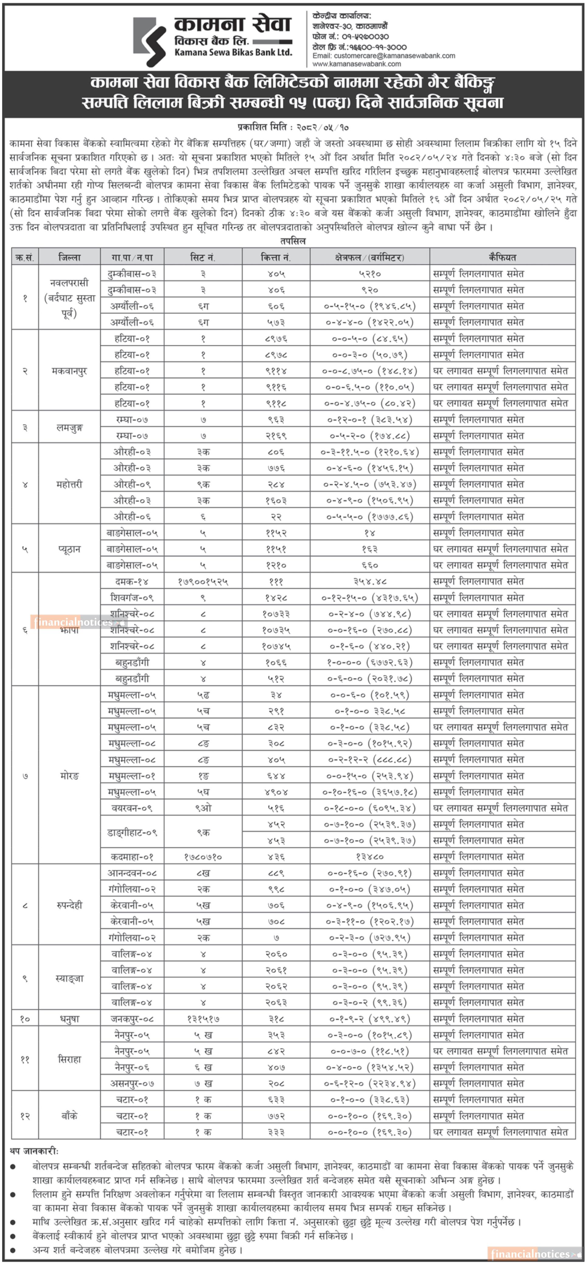 कामना सेवा विकास बैंकको गैह्र बैंकिङ्ग सम्पत्ति लिलाम बिक्री सम्बन्धी सूचना