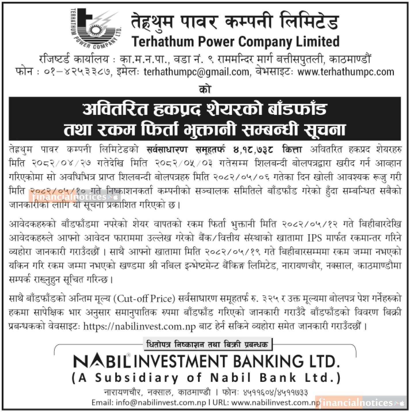 तेह्रथुम पावरको अवितरित हकप्रद शेयरको बाँडफाँड तथा रकम फिर्ता भुक्तानी सम्बन्धी सूचना