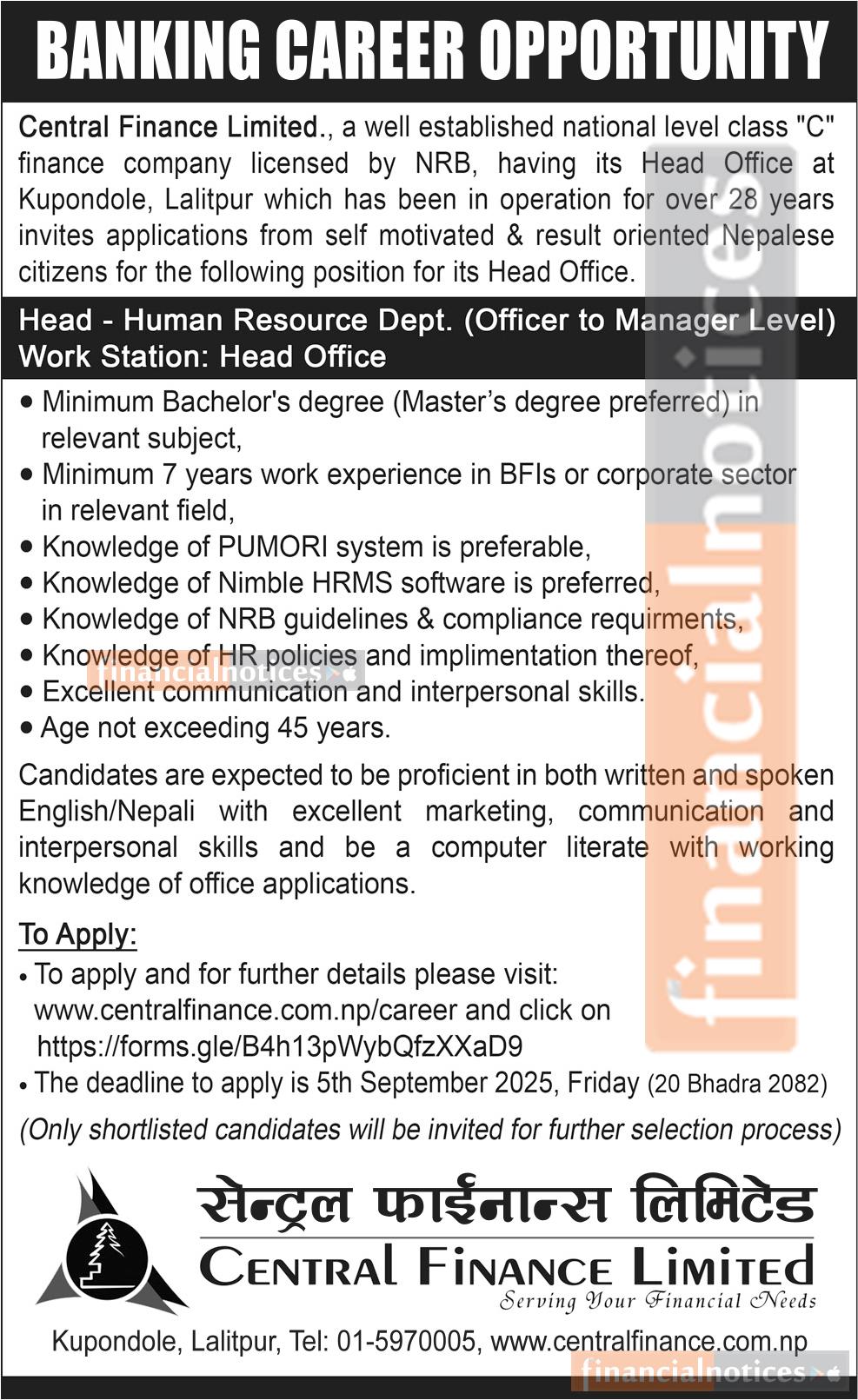 Lalitpur – Central Finance Limited, a well-established national-level Class “C” finance company licensed by Nepal Rastra Bank (NRB), has announced a vacancy for the position of Head of Human Resource Department (Officer to Manager Level) at its Head Office in Kupondole, Lalitpur.