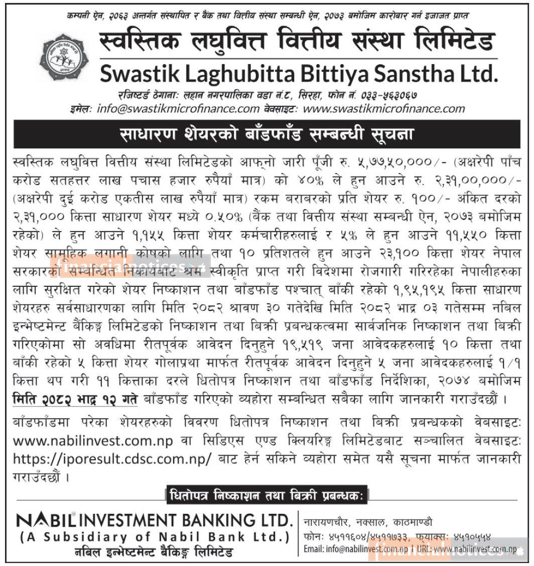 स्वस्तिक लघुवित्तको साधारण शेयरको बाँडफाँड सम्बन्धी सूचना -