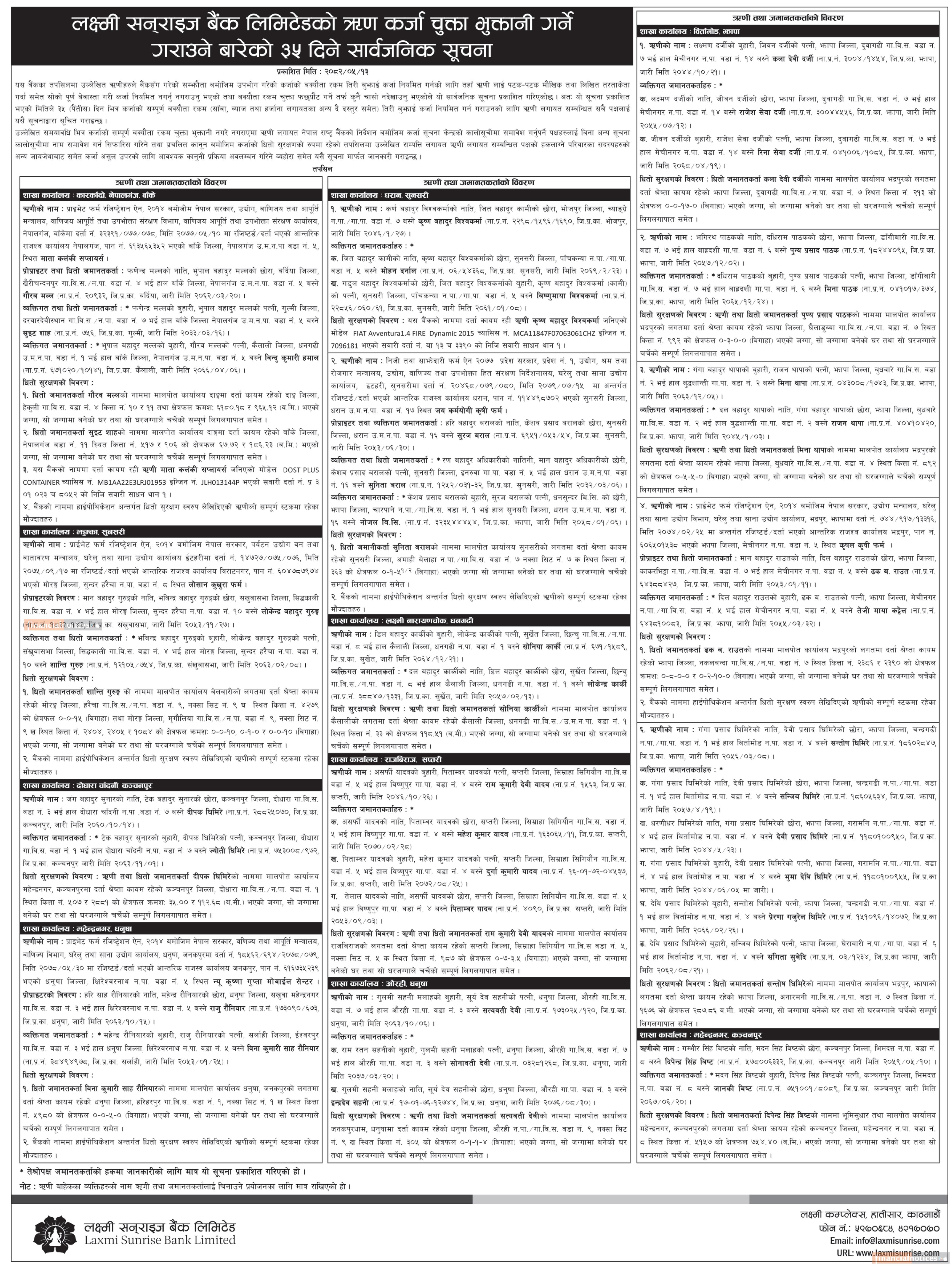 लक्ष्मी सनराइज बैंकको ऋण कर्जा चुक्ता भुक्तानी गर्नेबारे ३५ दिने सार्वजनिक सूचना -