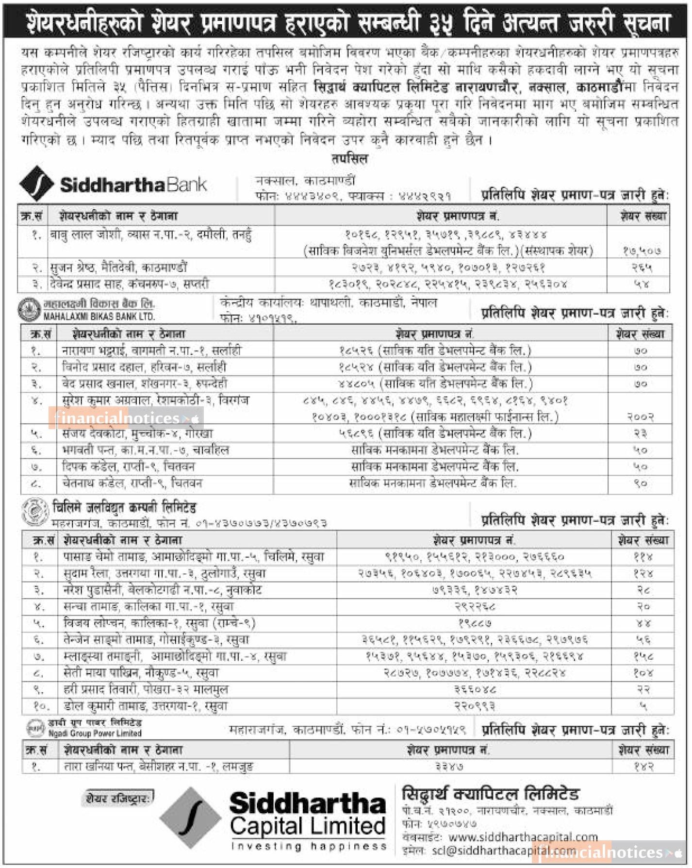 शेयर प्रमाणपत्र हराएको सम्बन्धी सूचना