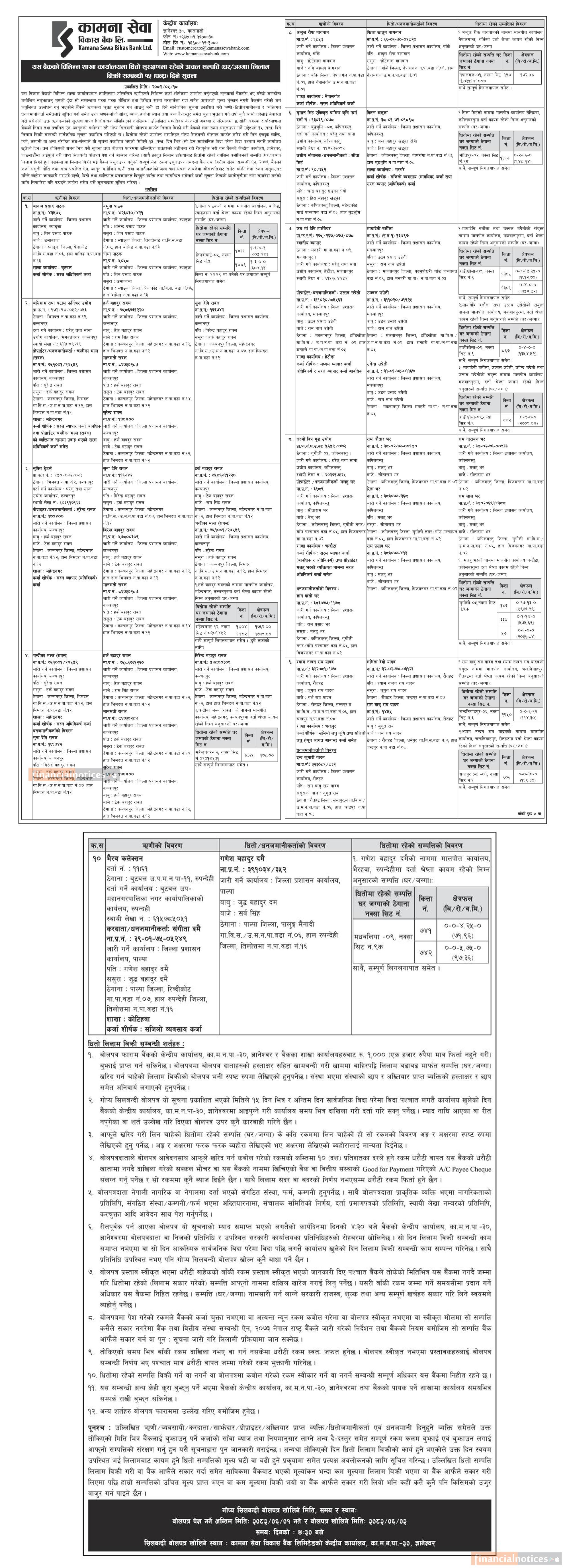 कामना सेवा विकास बैंकको शाखा कार्यालयमा रहेकाे धितो घर जग्गा लिलाम बिक्री सम्बन्धी सूचना -