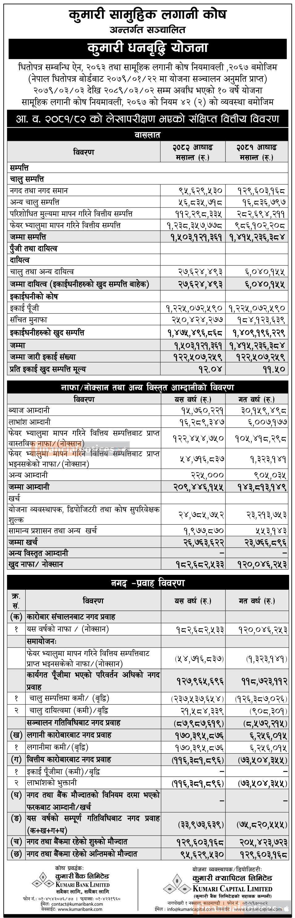 Kumari Capital published audited results of "Kumari Dhanabriddhi Yojana" for FY 2081/82