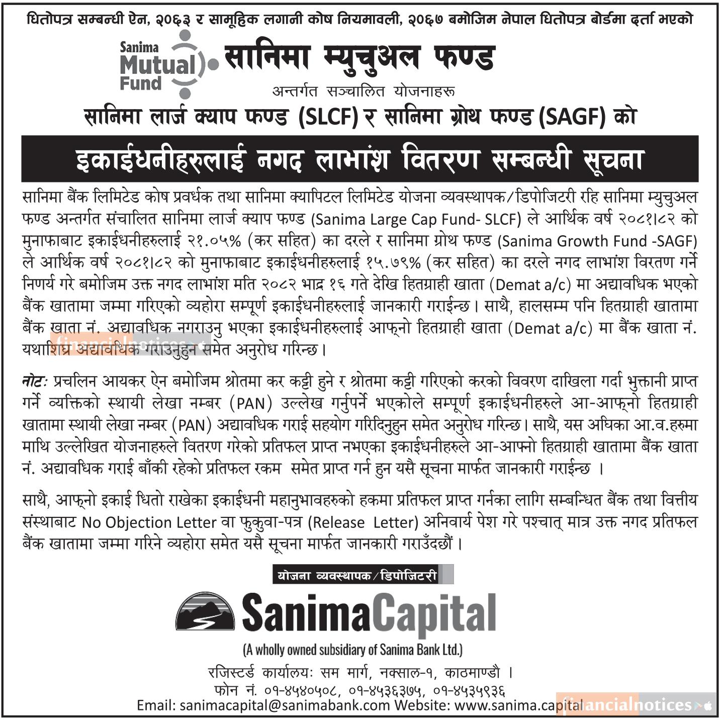सानिमा म्युचुअल फण्डका इकाईधनीलाई नगद लाभांश वितरण सम्बन्धी सूचना