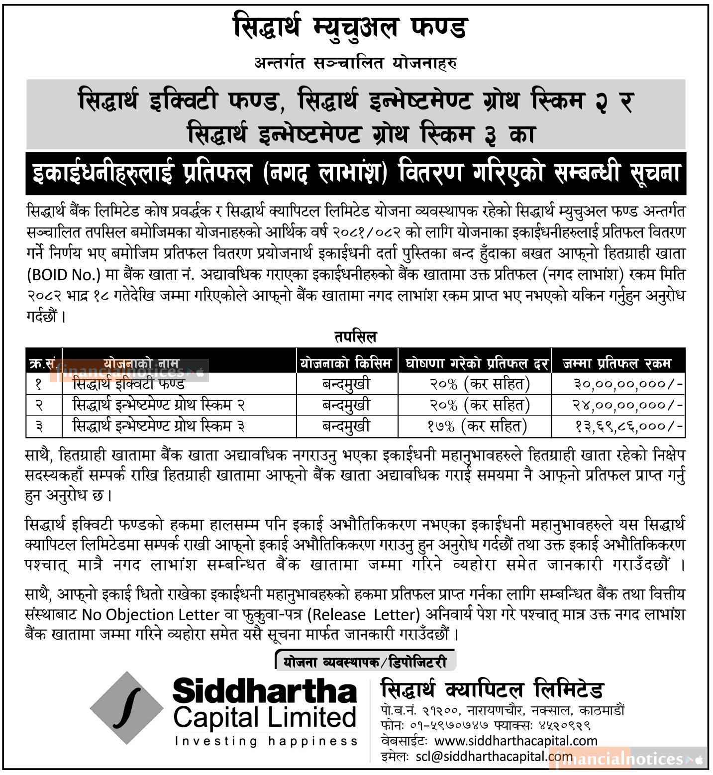 सिद्धार्थ इक्विटी फण्ड तथा ग्रोथ स्किमका लगानीकर्तालाई लाभांश वितरण सम्बन्धी सूचना