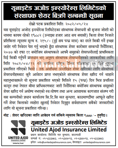 यूनाइटेड अजोड इन्स्योरेनसको संस्थापक शेयर बिक्री सम्बन्धी सूचना -
