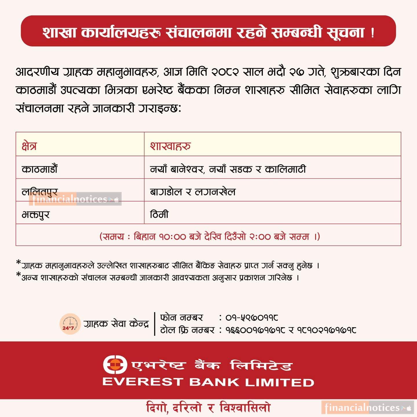 एभरेस्ट बैंकको शाखा कार्यालयहरु संचालनमा रहने सम्बन्धी सूचना