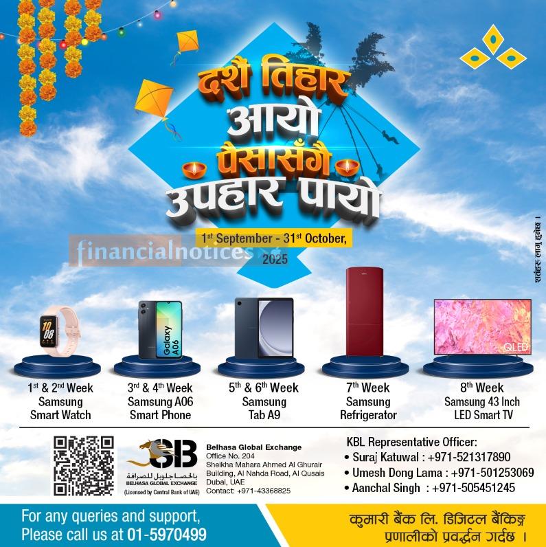 Celebrate this Dashain and Tihar with Belhasa Global Exchange (BGEX), UAE and Kumari Bank Limited. Send remittance to Nepal between 1st September – 31st October 2025 and get a chance to win exciting weekly gifts through a lucky draw.