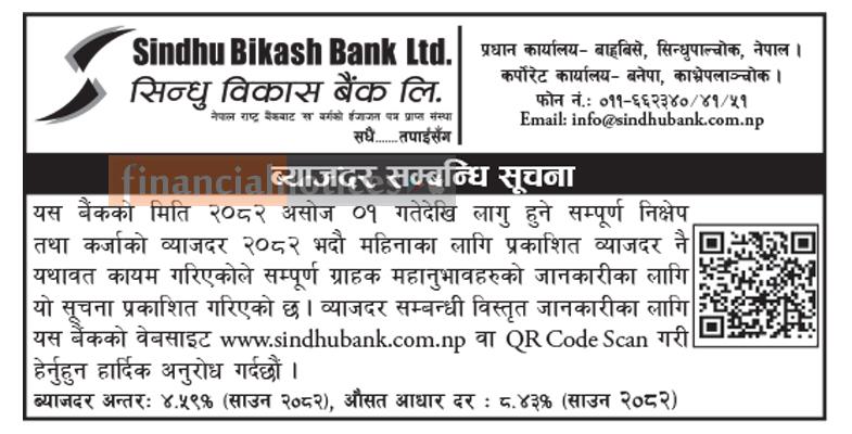 Sindhu Bikas Bank Limited has announced that the interest rates for its deposit and loan products will remain unchanged from the previous month, effective from 1st Ashwin, 2082. Customers can continue to plan their finances with the same rates.