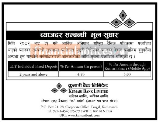 ब्याजदरमा भुलसुधार गरीएको सम्बन्धमा कुमारी बैंकको नयाँ सूचना