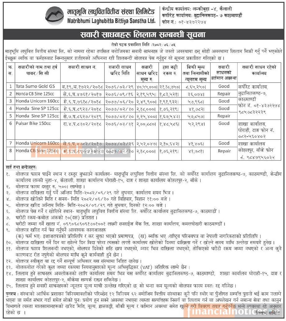 सवारी साधनहरु लिलाम बिक्री सम्बन्धी मातृभूमि लघुवित्तको सूचना -