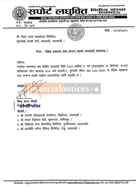 विशेष साधारण सभा सम्बन्धमा सपोर्ट लघुवित्तको सूचना -