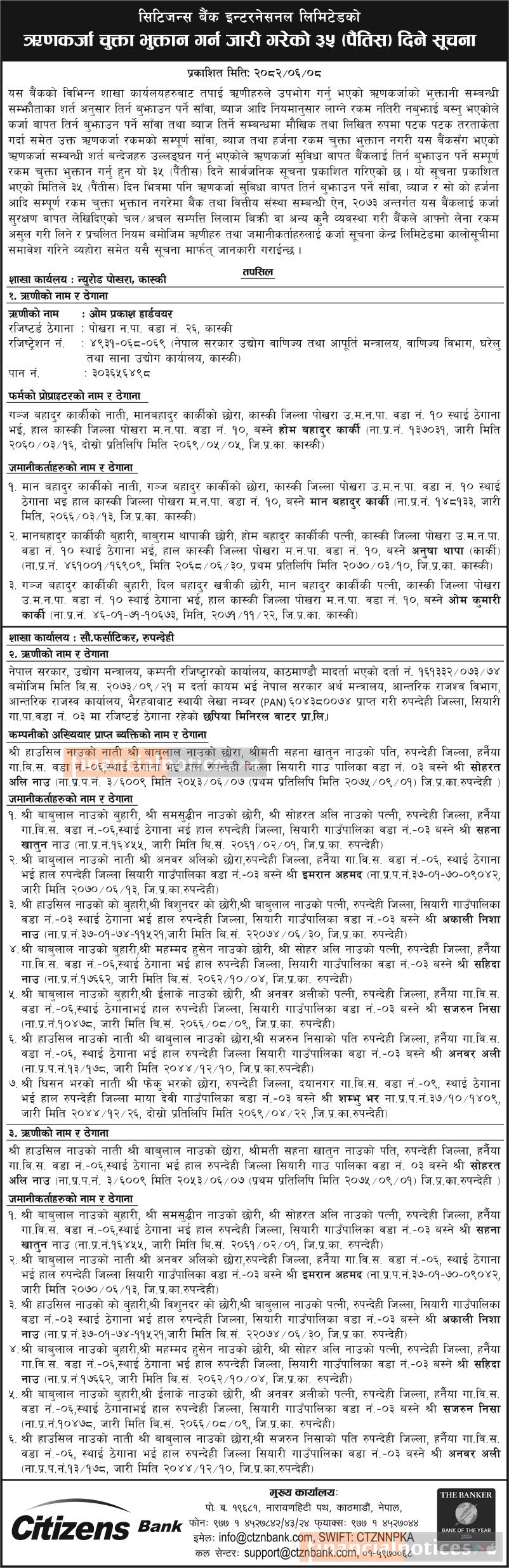 सिटिजन्स बैंकद्वारा ऋणकर्जा चुक्ता भुक्तान गर्न ३५ दिने सूचना जारी -