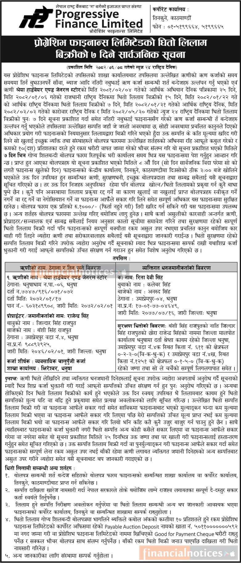 प्रोग्रेशिभ फाइनान्सको धितो लिलाम बिक्रीको ७ दिने सार्वजनिक सूचना -