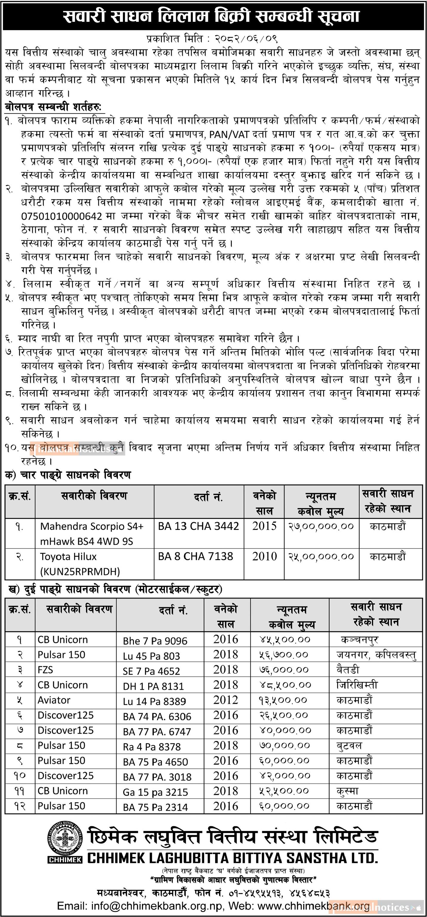 सवारी साधन लिलाम बिक्री सम्बन्धी छिमेक लघुवित्तको सूचना -