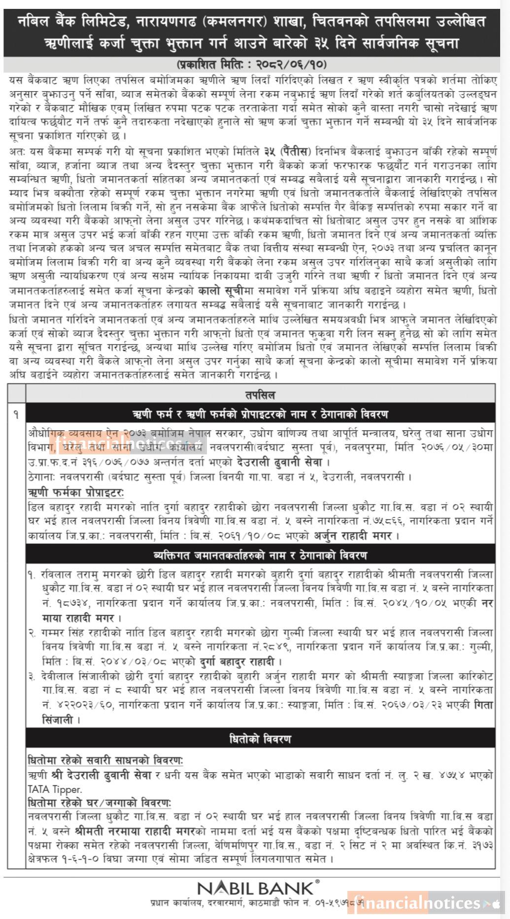 ऋणीलाई कर्जा चुक्ता भूक्तान गर्ने सम्बन्धी नबिल बैंकको सूचना