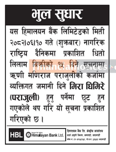 हिमालायन बैंकको भुल सुधार सम्बन्धी सूचना -
