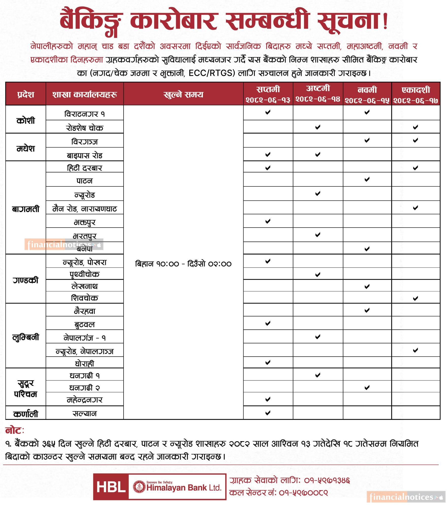 बैंकिङ्ग कारोबार सम्बन्धी हिमालयन बैंकको सूचना -