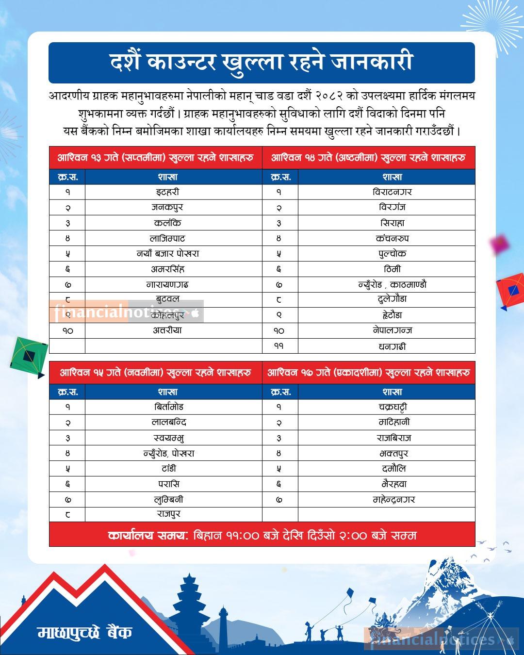माछापुच्छ्रे बैंकका ग्राहकहरूलाई दशैं काउन्टर खुल्ला रहने सम्बन्धी सूचना -