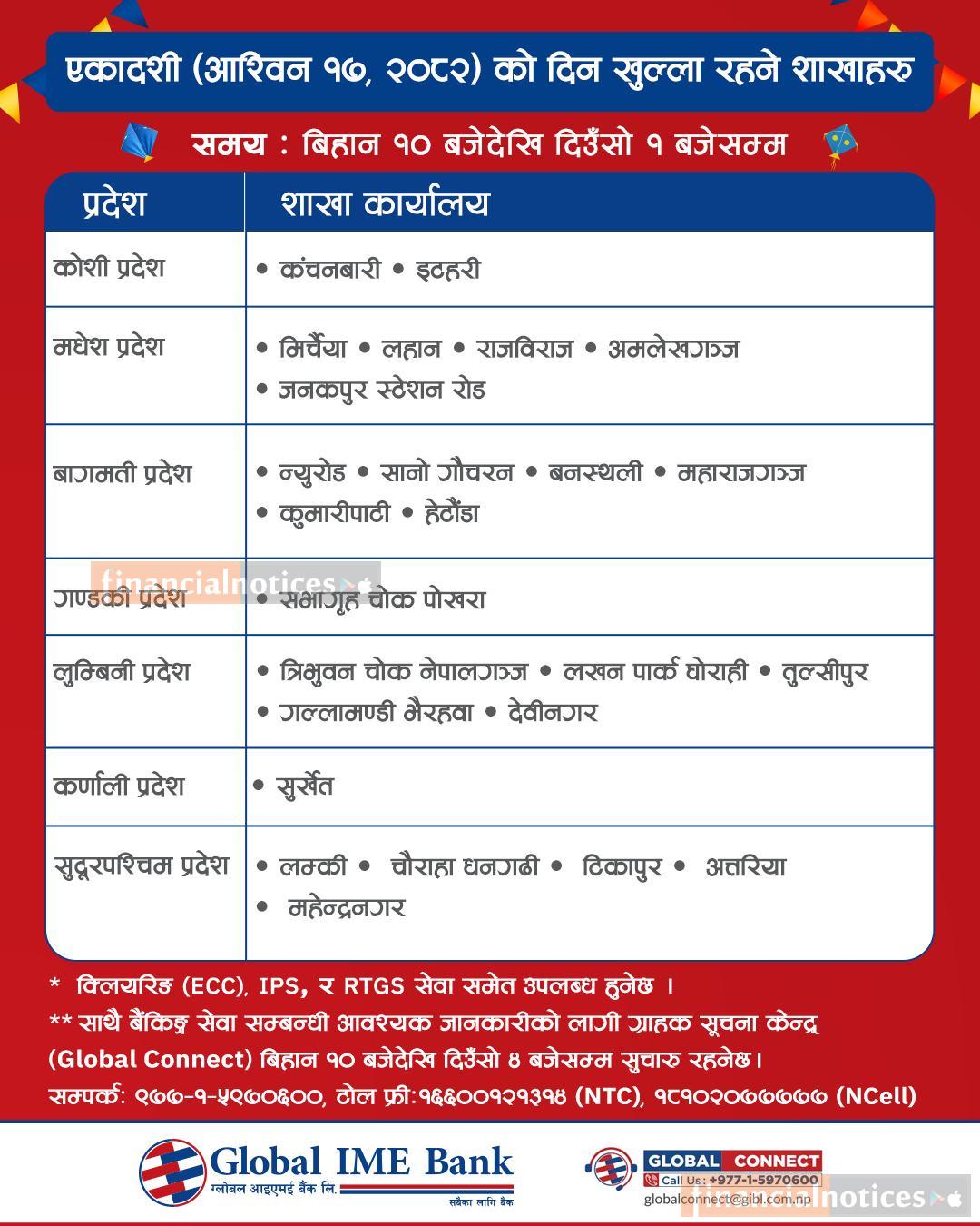 एकादशी (आश्विन १७, २०८२) को दिन शाखाहरु खुला रहने बारे सूचना