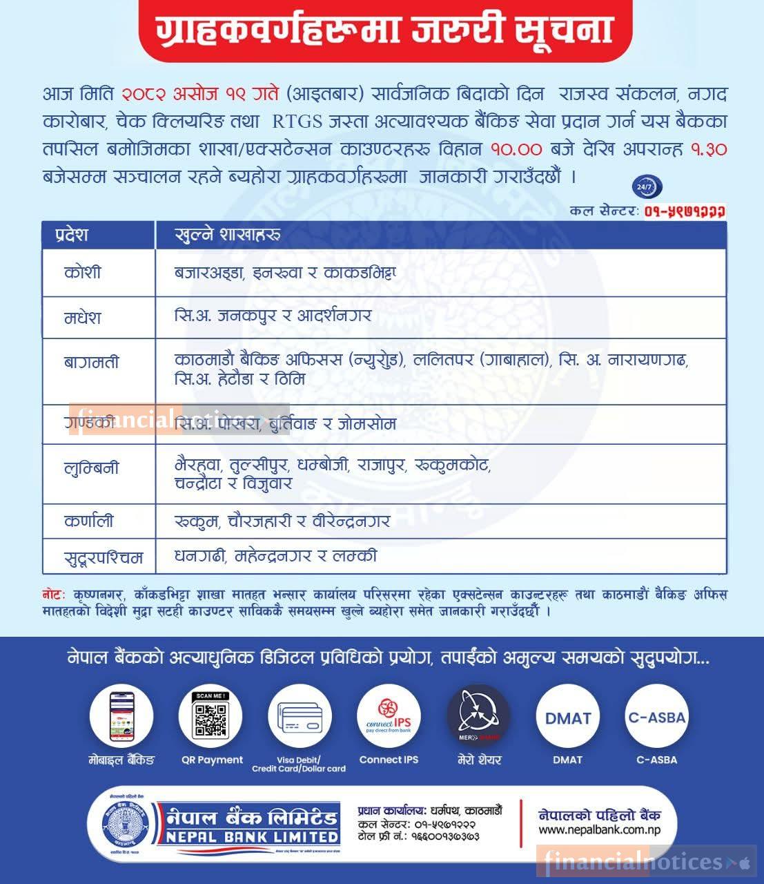 आज नेपाल बैंकका कुन कुन शाखा कति बजेसम्म खुल्ला रहन्छन् ?