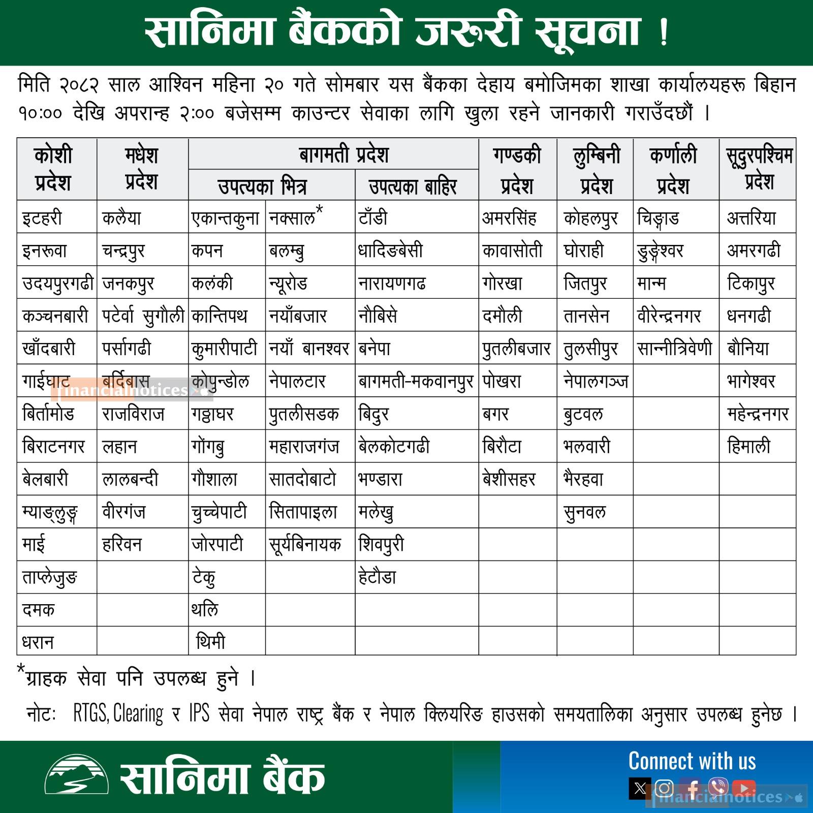 असोज २० गते सोमबारका दिन सानिमा बैंकको शाखाहरु खुल्ला रहने बारे जरुरी सूचना