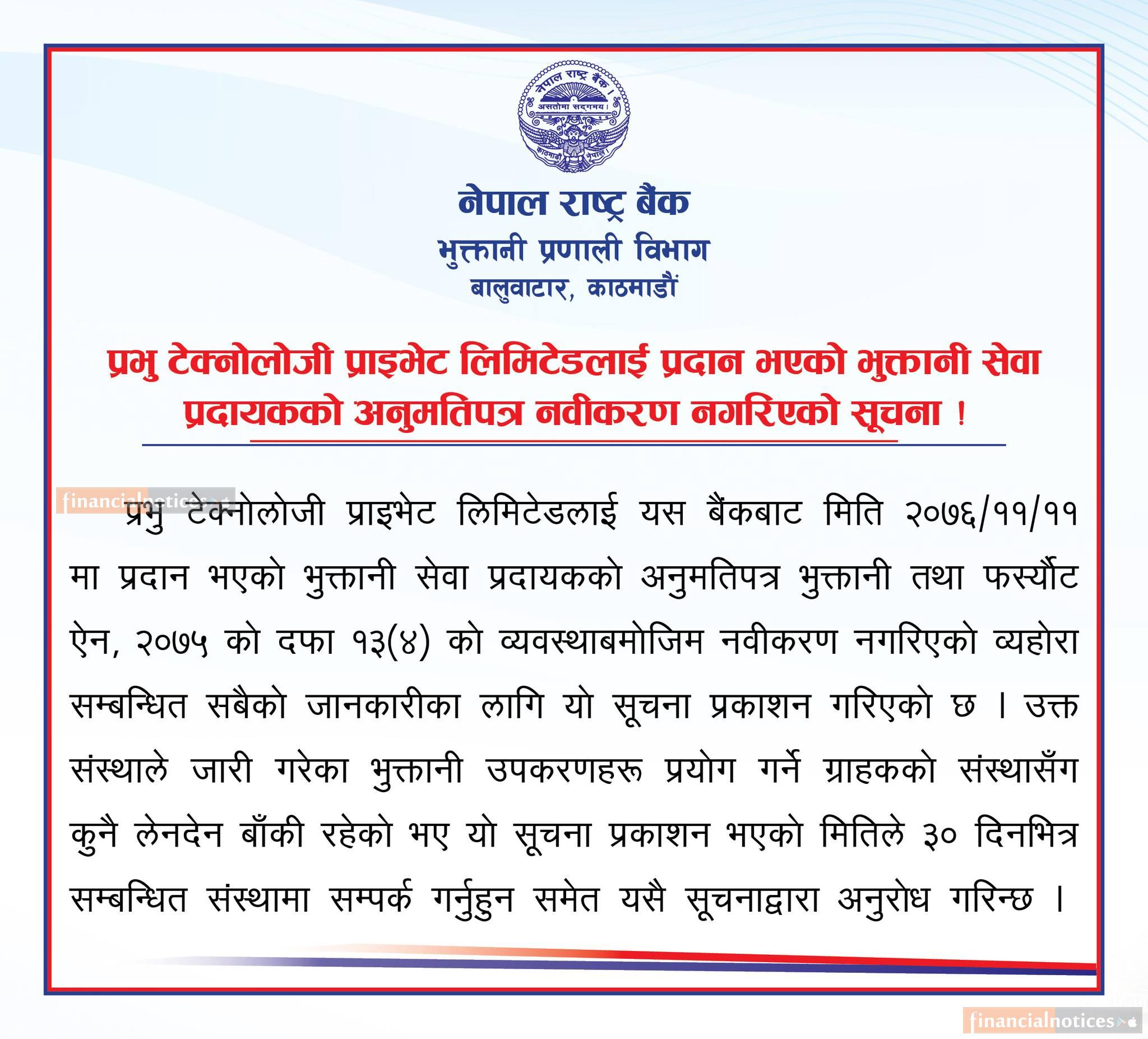 प्रभु टेक्नोलोजीको भुक्तानी सेवा प्रदायक अनुमतिपत्र नवीकरण नगरिएकोबारे राष्ट्र बैंकको सूचना -