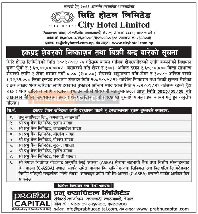 सिटी हाेटलकाे हकप्रद सेयरकाे निष्काशन तथा बिक्री बन्द बारेकाे सूचना