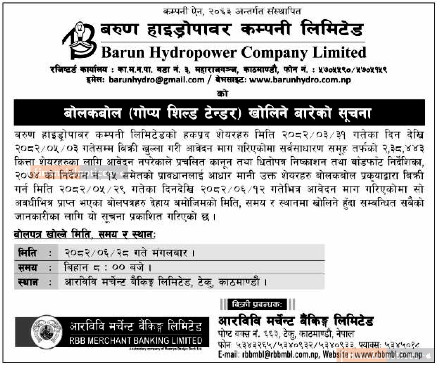 बरुण हाइड्रोपावरको हकप्रद शेयरको बोलकबोल खोलिने बारेको सूचना -