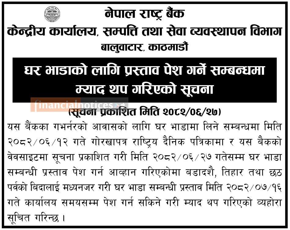 नेपाल राष्ट्र बैंकद्वारा घर भाडा प्रस्ताव पेश गर्ने म्याद थप सम्बन्धी सूचना