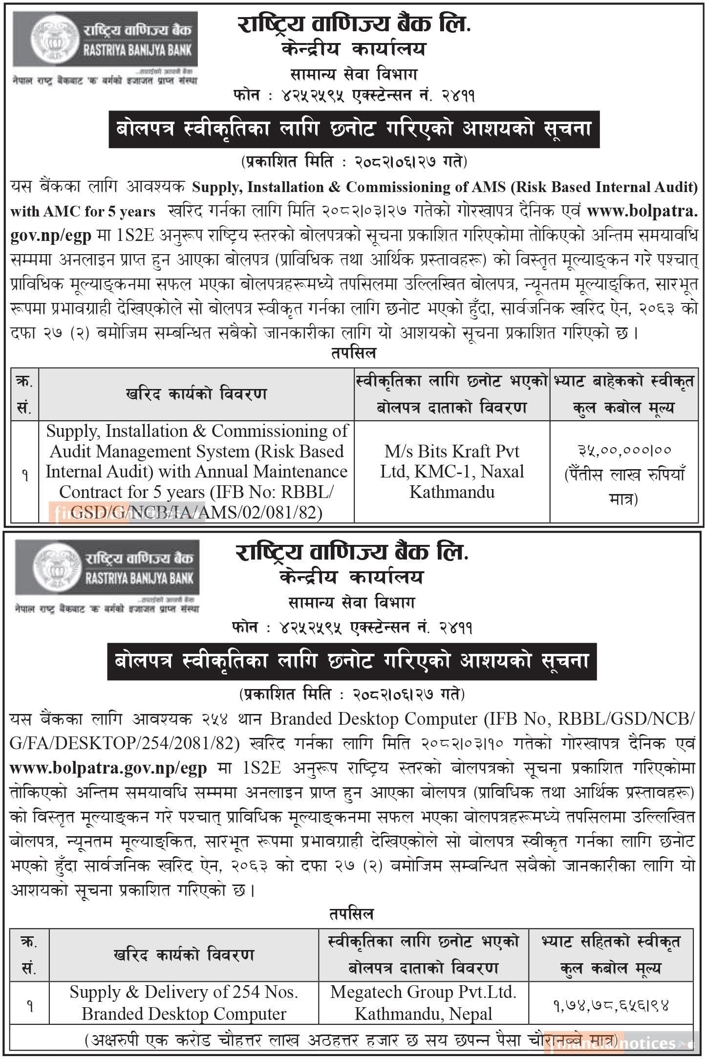 राष्ट्रिय वाणिज्य बैंकद्वारा बोलपत्र स्वीकृतिका लागि छनोट गरिएको सूचना