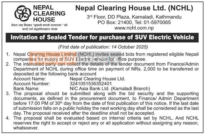 Invitation of Sealed Tender for Purchase of SUV Electric Vehicle -