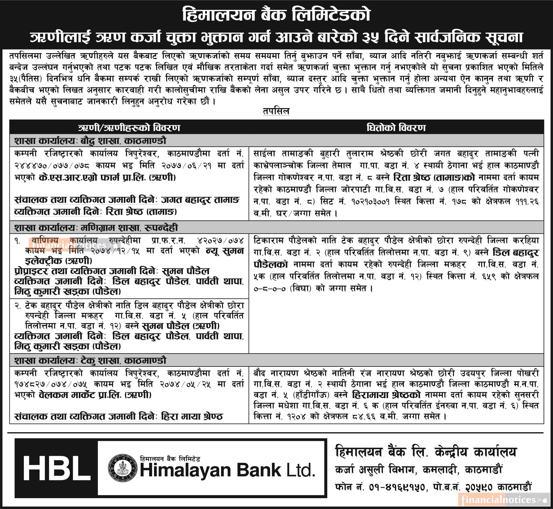 हिमालयन बैंकका ऋणीलाई ऋण कर्जा चुक्ता भुक्तान गर्न आउने बारेको ३५ दिने सार्वजनिक सूचना -