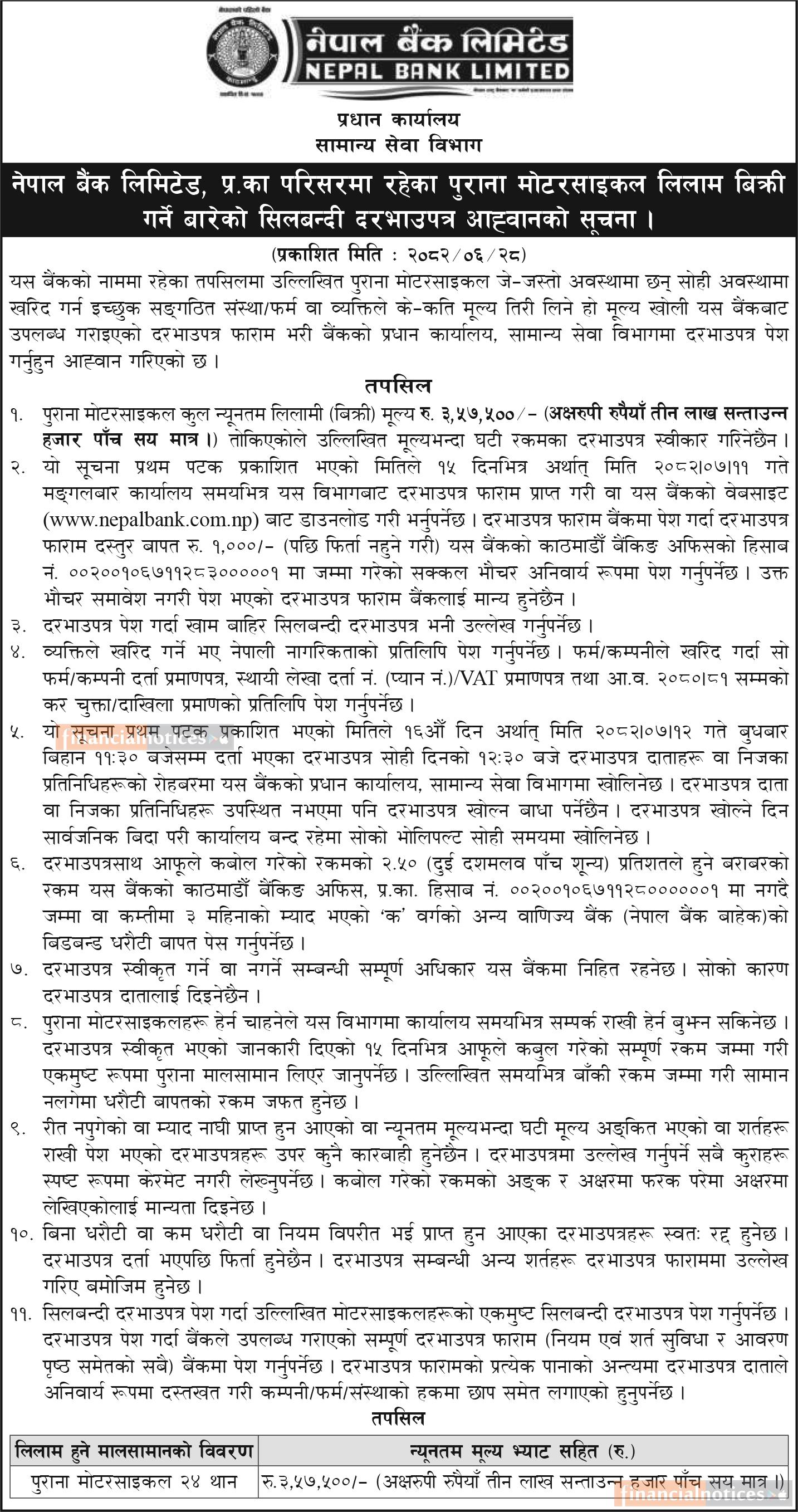 पुराना मोटरसाइकल लिलाम बिक्री सम्बन्धी नेपाल बैंकको सूचना -