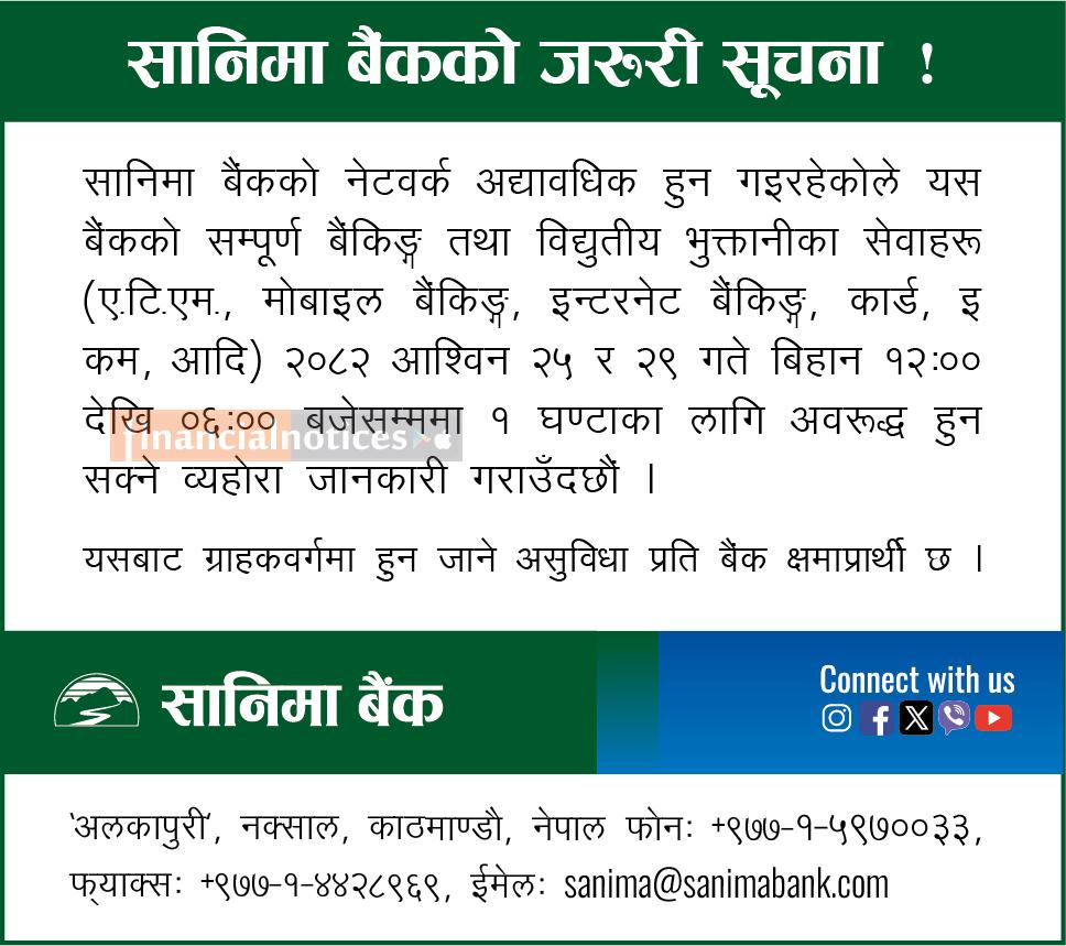 सानीमा बैंकको सेवा अस्थायी रुपमा बन्द हुने सूचना