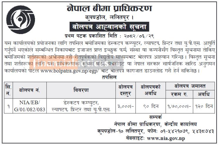 नेपाल बीमा प्राधिकरणकाे बाेलपत्र आह्वान सम्बन्धी सूचना -